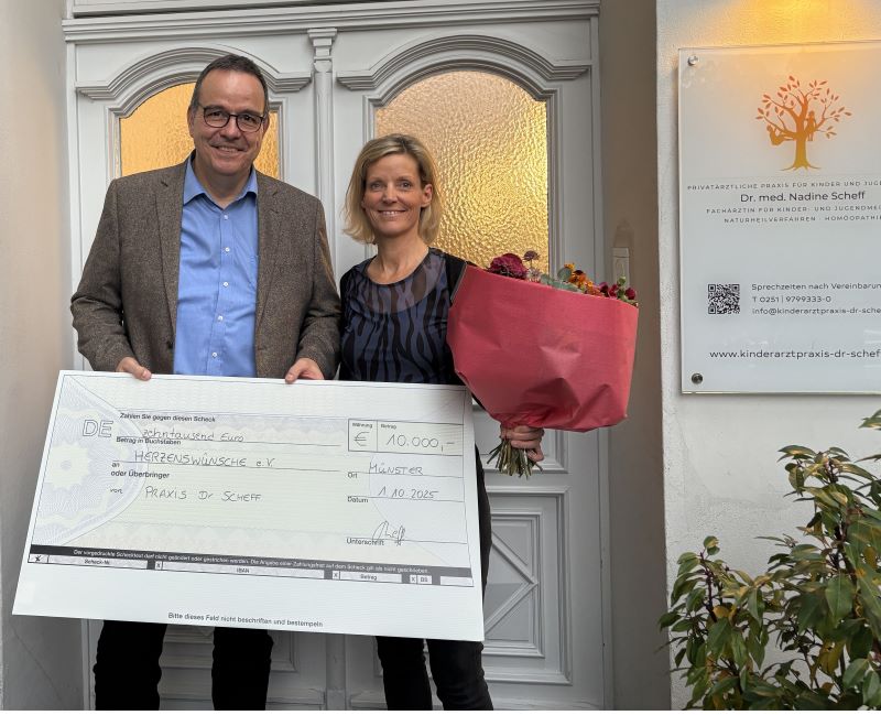 Die Münsteraner Kinderärztin Dr. Nadine Scheff hat anlässlich ihrer Geburtstagsfeier und darüber hinaus sehr erfolgreich die Werbetrommel für Herzenswünsche e.V. gerührt und damit die überwältigende Summe von 10.000 Euro gesammelt. Bei einem Besuch in ihrer Praxis bedankte sich Herzenwünsche-Vorstand und Kinderarztkollege Dr. Otfried Debus herzlich für die großzügige Spende.