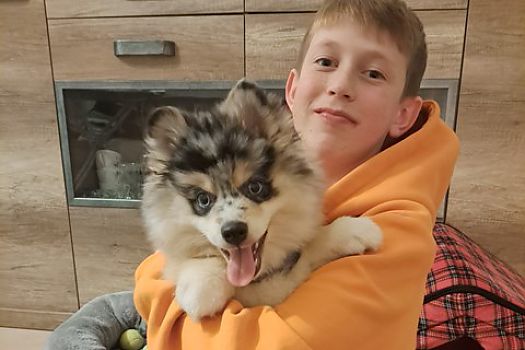 Timur ist ganz vernarrt in Sky. Stolz geht er mit der jungen Pomsky-Hündin spazieren. Stundenlang spielt er mit dem Welpen. Sky hat himmelblaue ...