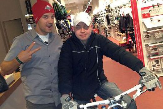Was für eine Überraschung! Beim Einkauf von Cedric’s großem Wunsch, einem Downhill-Fahrrad, trafen wir einen echten Profi: Freerider Florian ...