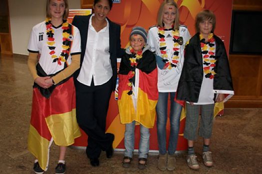... in Berlin verfolgten Rachel, Marieke, Lea und Silas mit großer Spannung. Nach dem verdienten Sieg "ihrer" Spielerinnen freuten sich die vier, ...