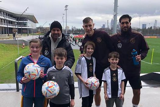 Maja, Moritz, Leonard und Philipp (v.l.n.r.) trafen Bundestrainer Hansi Flick, Niclas Schlotterbeck sowie Emre Can beim Abschlusstraining in ...